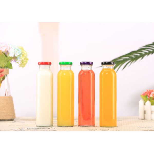 Those empty glass fruit drink bottles are made of high food grade glass, which not only resists high or low temperatures, but also does not contain lead and is 100% food safe.